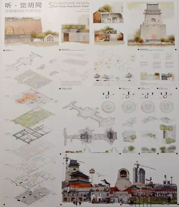 张雪娟的《听-觉胡同:钟鼓楼街区声景设计》除了对场地的基础分析,还按照声区将钟鼓楼街区进行划分,按照不同声区的特性确定设计方案,是以声觉为导向进行环艺设计的一种尝试。
