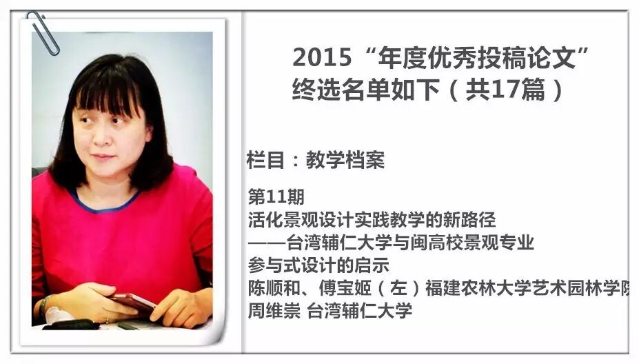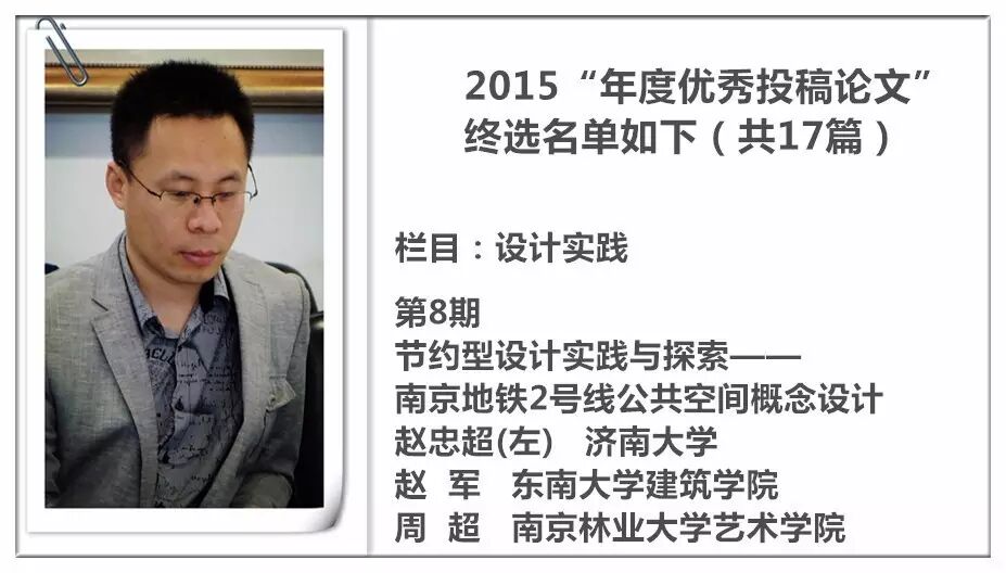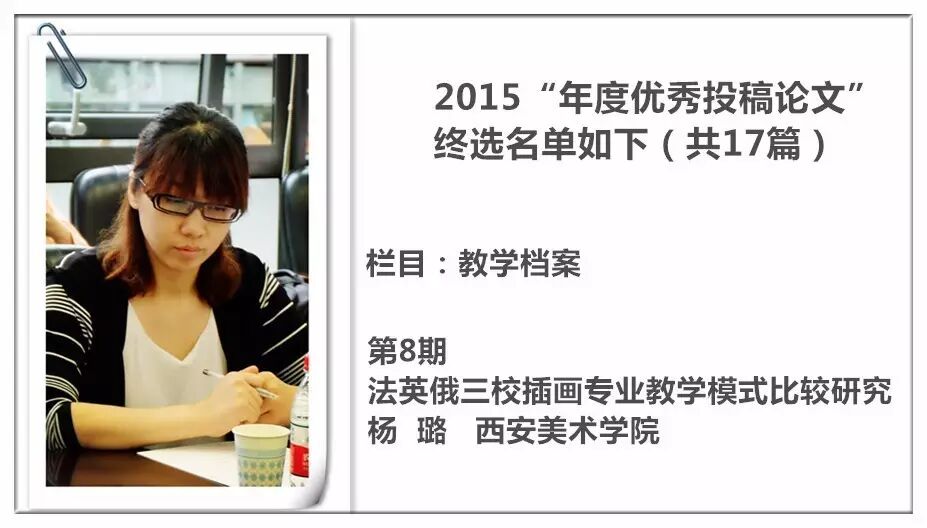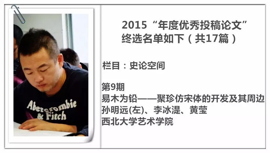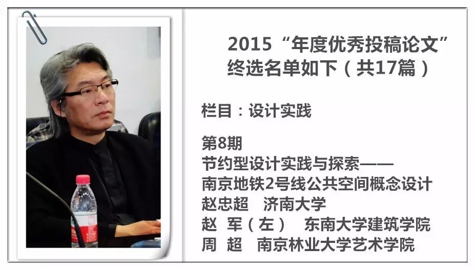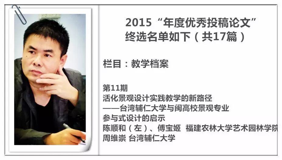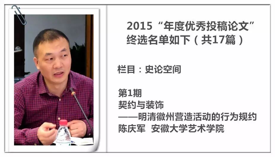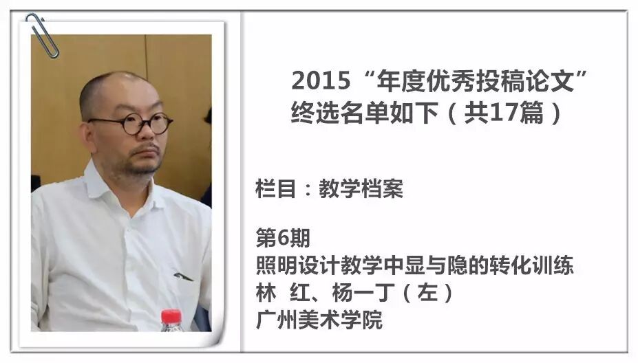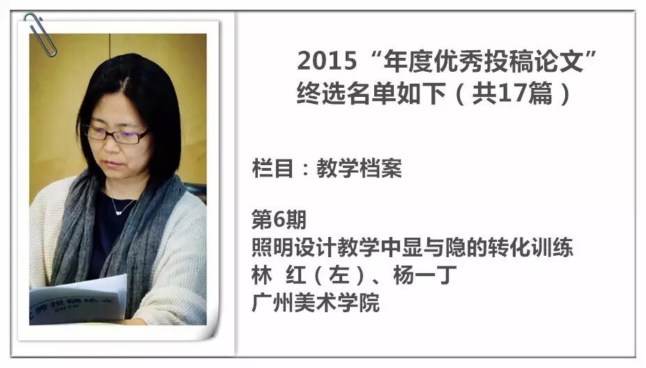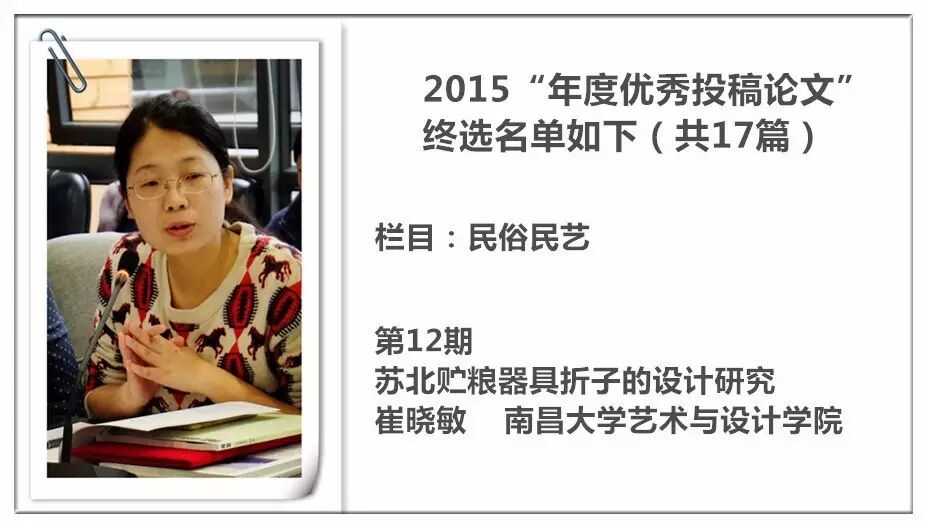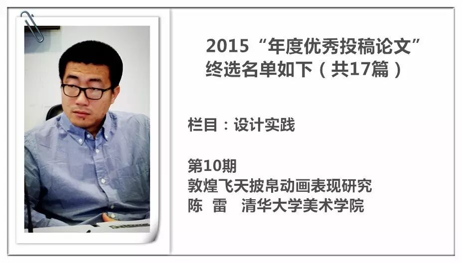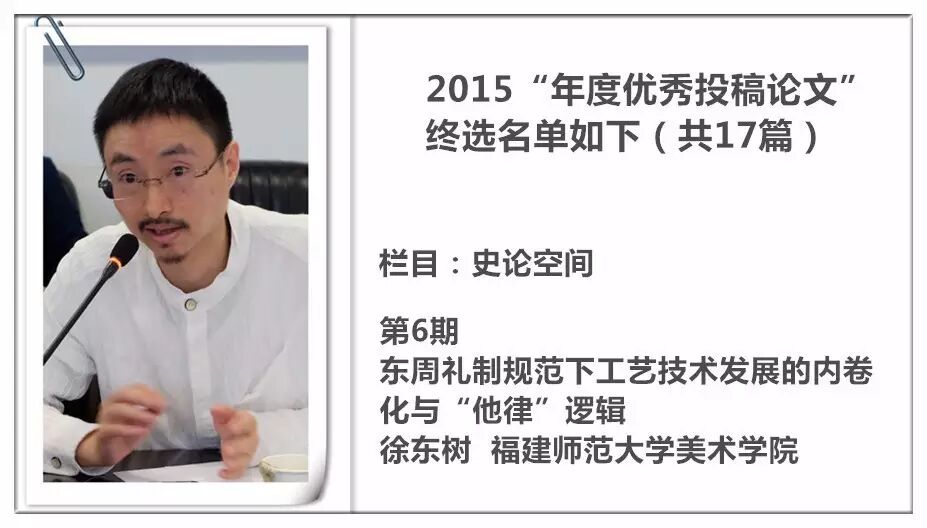 2014 年,《装饰》杂志进行了首次“年度优秀投稿论文”的评选暨交流活动,并从此作为年度常设活动举办,今年已是第三届。评选以2015 年《装饰》杂志发表的投稿论文为对象,主要集中在《教学档案》《史论空间》《个案点击》《设计实践》《民俗民艺》五个栏目。经过栏目编辑的严格审定与投票讨论,从数百篇已发表的论文中精挑细选出主题鲜明、观点新颖、论据可靠、语言精炼、可读性强,并有原创性的17篇佳作为“年度优秀论文”。被授予“年度优秀作者”荣誉称号的29 位作者则来自近20 所高校,地区范围涵盖了国内十余个省市。