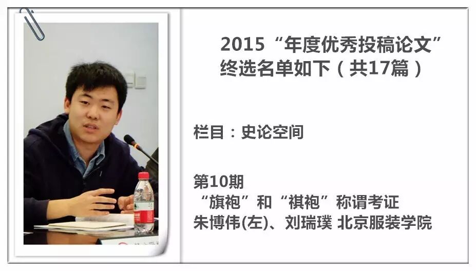 2014 年度的优秀作者、同样来自北京服装学院的王子怡非常赞同主编方晓风所说的“整个学术界更为重视设计实践,而相对较为轻视学术研究”。在她看来,高校教师在教学和参与社会项目实践的过程中,往往忽略做研究的重要性,甚至把发表论文看作一种负担。而实际上,把参与项目和教学的过程中的体会和感想系统整理出来,落实到纸面文字,就是所谓的“研究”。她认为朱博伟的论文被评为“优秀论文”,既是意料之外,又在情理之中。这一切来自良好的家庭教养和勤奋好学的研究态度。从研究生入学到现在,他以非常严谨的方法测量了北服博物馆很多旗袍的精确数据,并相应绘制了结构图,还亲自动手做了30 多件(套)清末民国时期样式的旗袍、袄、裤。他对旗袍的制作和研究下的功夫是非常难能可贵的,贯彻了从理论到实践的各个方面。